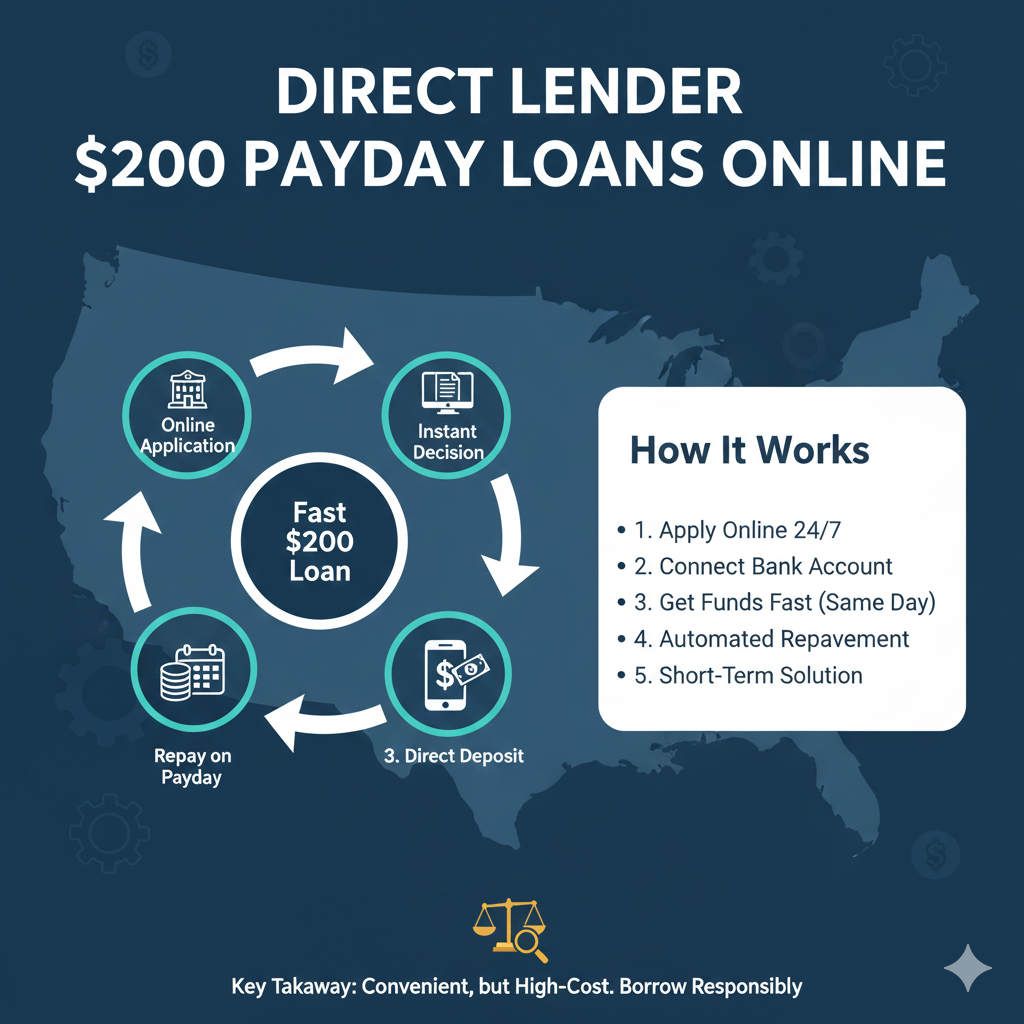 Direct lender $200 payday loans online are short-term, small-dollar loans designed to help you cover urgent expenses when cash is tight. With minimal documentation and fast decisions, many borrowers choose these loans to bridge the gap between paychecks, pay an unexpected bill, or manage an emergency. Unlike traditional bank loans, direct lender payday loans are issued directly by the lender, eliminating middlemen and often speeding up funding. However, it’s important to understand how they work, what to expect in terms of cost, and how to choose a reputable lender.